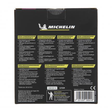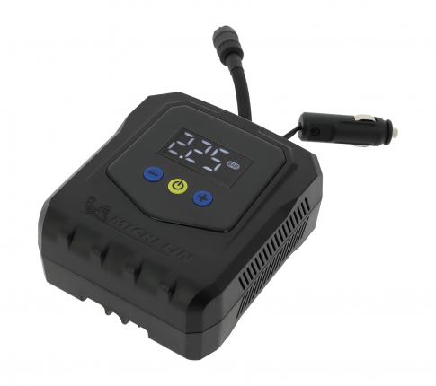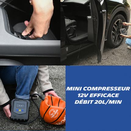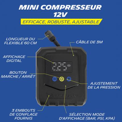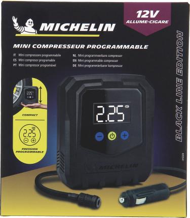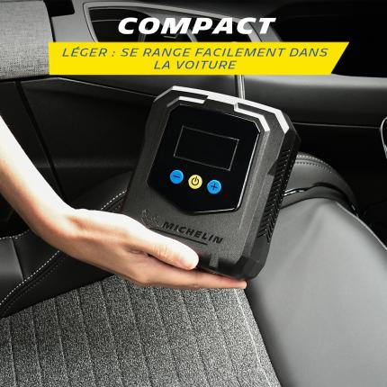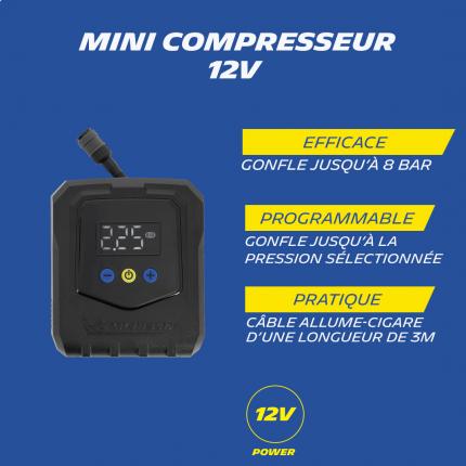 MINI COMPRESSEUR PROGRAMMABLE Branchement sur prise allume-cigare 12V, câble 3m Affichage LED grand format 2,3 pouces Fonction de programmation: Le gonflage s'arrêtera automatiquement à la pression souhaitée Ajuste la pression d'un pneu standard* en 1min30 Pression de gonflage max 8,3 BAR Contient 3 embouts pour le gonflage des vélos, ballons et jeux gonflables Specs techniques: Débit d'air à vide: 20L/min Unités de mesure: BAR, PSI Puissance 138W Courant max: 12A Température de fonctionnement: -10°C à 45°C