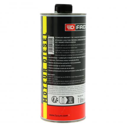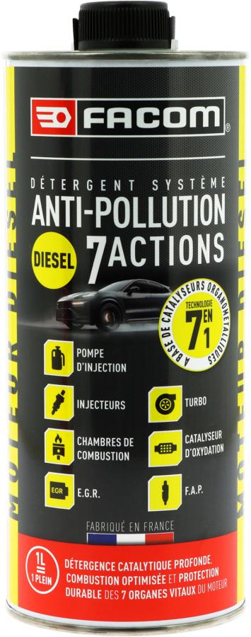 DETERGENT SYSTEME ANTI-POLLUTION - MOTEUR DIESEL 7 ACTIONS EN 1 PRODUIT Technologie innovante 7 en 1 à base de catalyseurs organométalliques. Détergence catalytique profonde, combustion optimisée et protection durable des 7 organes vitaux du moteur. Détergent système anti-pollution nouvelle génération, ultra-complet, renforcé en catalyseurs de combustion de dernière génération. Moteurs diesel. Il effectue 7 actions sur les composants essentiels du moteur : La pompe d injection, les injecteurs, les chambres de combustion, la vanne EGR, le turbo, le catalyseur d oxydation, le filtre à particules. Son action détergente catalytique très haute performance permet un décrassage optimal et une protection durable. Sans démontage = 1 produit prêt à l emploi à verser dans votre réservoir de carburant. 1 seule dose = Performance moteur restaurée dès 50 km. Réduction des émanations polluantes et de la consommation. Facilite le passage au contrôle technique. Préserve et prolonge la durée de vie du moteur. Formule professionnelle très haute performance à action rapide, curative et préventive. Mode d emploi : Traitement recommandé tous les 20 000 Km et avant chaque contrôle technique. Agiter avant emploi. Verser la dose complète dans le réservoir juste avant de faire le plein. 1 L pour 40 à 70 litres de carburant. Compatible avec tous les systèmes d injection Diesel (Common rail, injecteurs pompes) et tous les systèmes de dépollution.