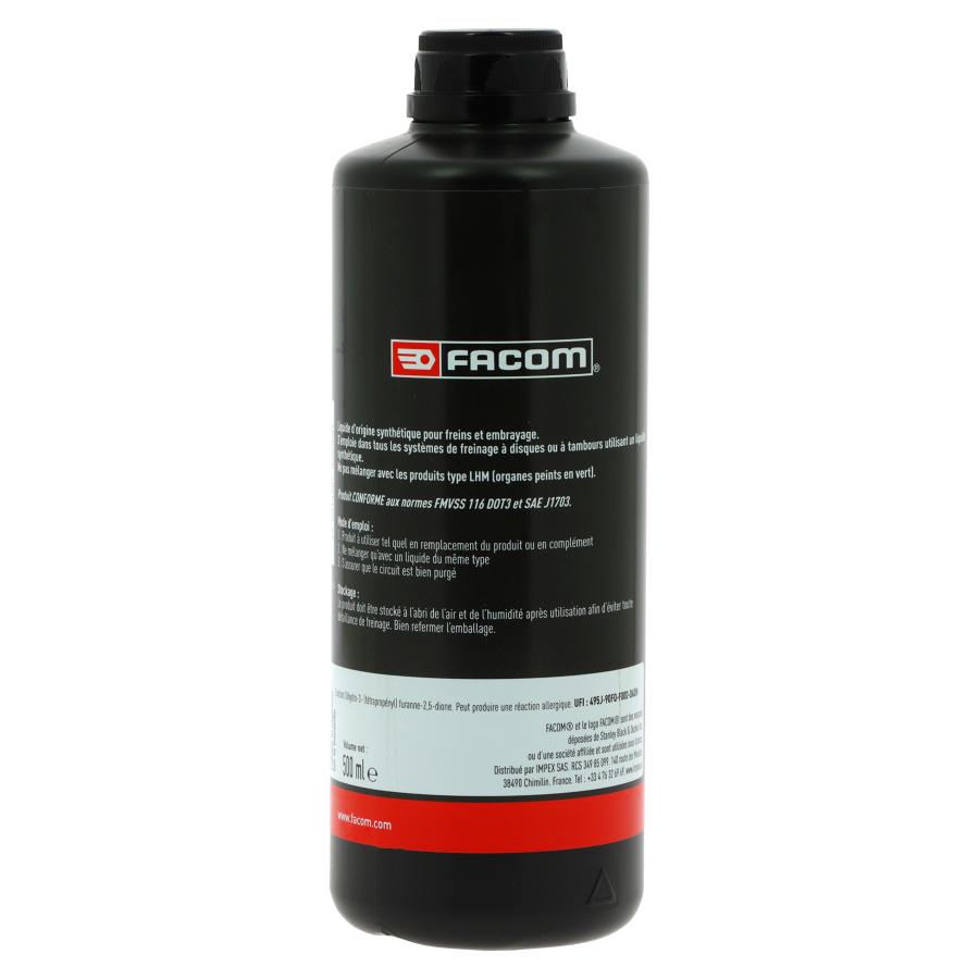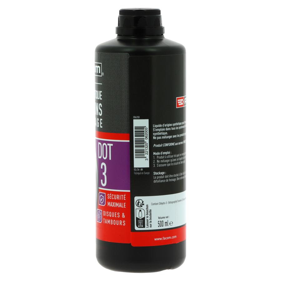 LIQUIDE DE FREINS FACOM DOT 3 500 ML DESCRIPTIF FONCTIONNEL - Liquide d'origine synthétique pour frein et embrayage. - S'emploie dans tous les systèmes de freinage à disques ou à tambours utilisant un liquide synthétique. - Ne pas mélanger avec les produits type LHM (organes peints en vert). DESCRIPTIF TECHNIQUE - Aspect : Liquide limpide, exempt de matières en suspension et sédiments de couleur incolore à ambre - Composition : Mélange de polyglycols, éther de glycol et inhibiteurs CARACTERISTIQUES PHYSICO-CHIMIQUE - Masse volumique : 1,003 à 1,060kg/l à 20°C - Point d'ébullition sec : > 205°C - pH: 7 à 11,5 - Viscosité cinématique à 100°C : >1.5 cS - Viscosité cinématique à -40°C : <1500 cS MODE D EMPLOI - Produit à utiliser tel quel en remplacement du produit ou en complément - Ne mélanger qu'avec un liquide du même type - S'assurer que le circuit est bien purgé LEGISLATION - Produit CONFORME aux normes FMVSS 116 DOT3 et SAE J1703