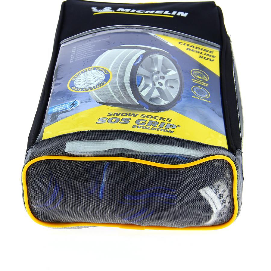 MICHELIN SOS GRIP® EVOLUTION, des Chaussettes à neige Textile Hautes performances et facile à installer. La nouvelle structure textile exclusive MICHELIN procure aux automobilistes une excellente adhérence, une motricité maximale et une facilité de montage, sans effort, en moins de deux minutes. Grâce à la mise au point de Multi bandes Textiles Ultra-absorbantes, la performance des chaussettes SOS GRIP® EVOLUTION augmente de +50% sur neige au démarrage. La bande de roulement en polyester haute résistante permet au produit de pouvoir être réutilisé sur plusieurs saisons. Également compatible avec les dispositifs ESP et ABS, cette chaussette à neige n'engendre aucune vibration lors de la conduite. MICHELIN SOS GRIP® EVOLUTION est un dispositif particulièrement adapté pour une utilisation d'urgence sur route enneigée, sur une courte distance et à une vitesse maximale de 50km/h. Adaptées également pour les véhicules avec passages de roue réduits. Grâce à son sac ultra compact, les chaussettes SOS GRIP® EVOLUTION seront toujours à porter de main. Conforme à la réglementation française : Arrêté ministériel des Transports du 18 juillet 1985 : «DISPOSITIFS ANTIDÉRAPANTS ÉQUIPANT LES PNEUMATIQUES» Il est important de vérifier dans le manuel du constructeur automobile, la chaînabilité de votre véhicule avant de vous équiper. Conforme à la norme EN16662-1 Compatible véhicule électrique