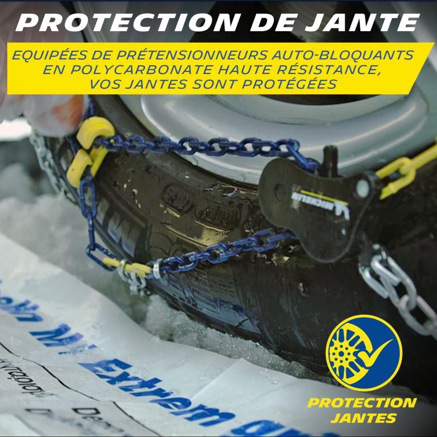 Paire de chaînes à neige homologuée à croisillons asymétriques pour une efficacité optimale en traction, virage et freinage. Visibilité plus : Extrem Grip® est équipé du système réfléchissant NVS -Night Vision Security- de Michelin qui accroît la visibilité nocturne latérale du véhicule. Chaînes à maillons de section carrée 9mm. Tension manuelle autobloquante. Butées de protection des jantes et enjoliveurs Fermeture d'accroche plate et pivotante. Repères de couleurs pour une facilité de montage. Livrées avec 2 maillons de rechange, une paire de gants à manche longue, une notice de montage plastifiée servant de tapis et un manuel utilisateur. Emballées dans une valisette antichocs avec 2 compartiments intérieur pour tenir les 2 chaînes séparées et éviter l'emmêlement.