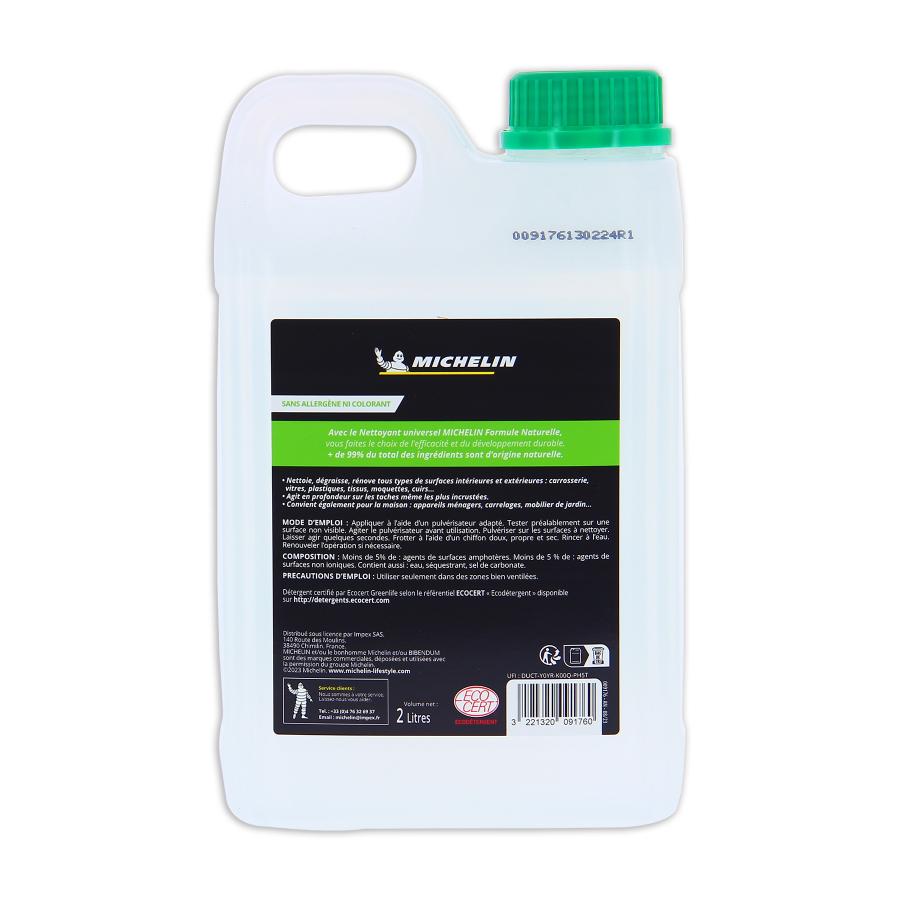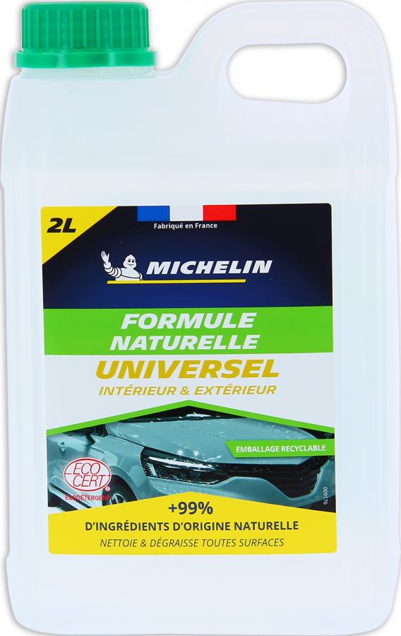 Avec le Nettoyant universel MICHELIN, vous faites le choix de l'efficacité et du développement durable. - Nettoie, dégraisse, rénove tous types de surfaces intérieures et extérieures : carrosseries, vitres, plastiques, tissus, moquettes, cuirs - Agit en profondeur sur les taches même les plus incrustées. - Convient également pour la maison : appareils ménagers, carrelages, mobilier de jardin + de 99 % du total des ingrédients sont d origine naturelle. Détergent certifié par ECOCERT Greenlife selon le référentiel ECOCERT disponible sur http://detergents.ecocert.com Bidon de 2 litres