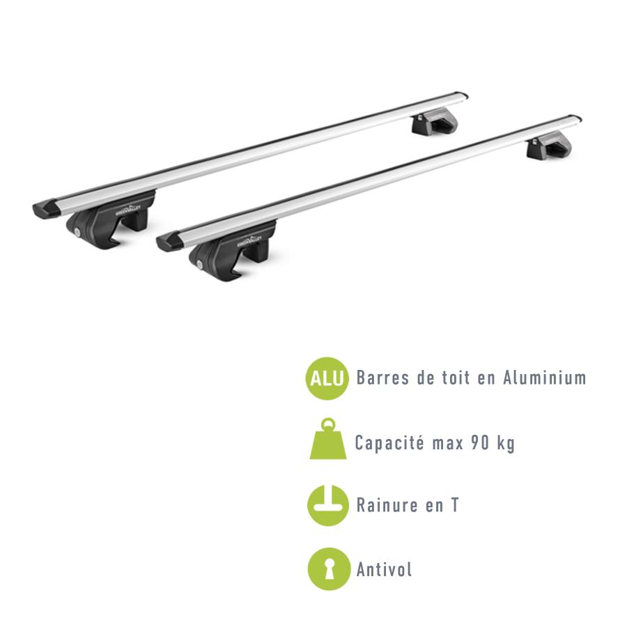 Green Valley 2 barres de toit Alu TRAX 135cm Barres de toit en profilé d'aluminium avec pieds prémontés et prêtes à l'emploi. Pour véhicules équipés de barres longitudinales standard (railing ouvert). Installation rapide, outils d'installation fournis. Couvercle avec dispositif antivol inclus (2 serrures réelles et 2 serrures en plastique ). Protection en caoutchouc dans les zones en contact avec le railing. Installation rapide, une seule vis par pied permet de serrer simultanément le pied sur la voiture et le pied sur la barre. Charge maximale à 90 kg