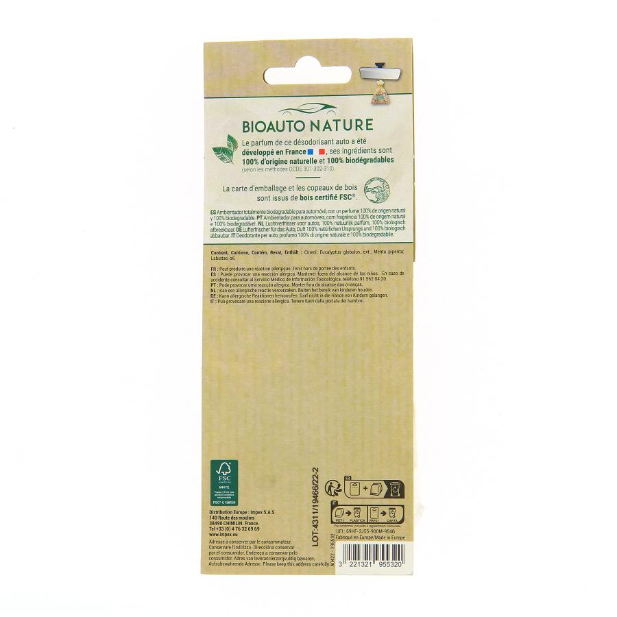 Sachet de copeaux de bois à suspendre au rétroviseur. Ce désodorisant auto apportera une touche déco naturelle à votre voiture. La gamme de désodorisant voiture Bio Auto Nature est une gamme respectueuse de l'environnement aux senteurs 100% d'origine naturelle pour votre auto. Le parfum de ce désodorisant auto a été développé en France, ses ingrédients sont 100% d'origine naturelle, et 100% biodégradables (selon les méthodes OCDE 301-302-310). Il contient de l'huile essentielle de citron jaune bio. Le parfum frais à la menthe de ce désodorisant vous permettra d'avoir une agréable sensation de fraicheur dans votre auto. La carte d'emballage et les copeaux de bois sont issus de bois certifié FSC®.