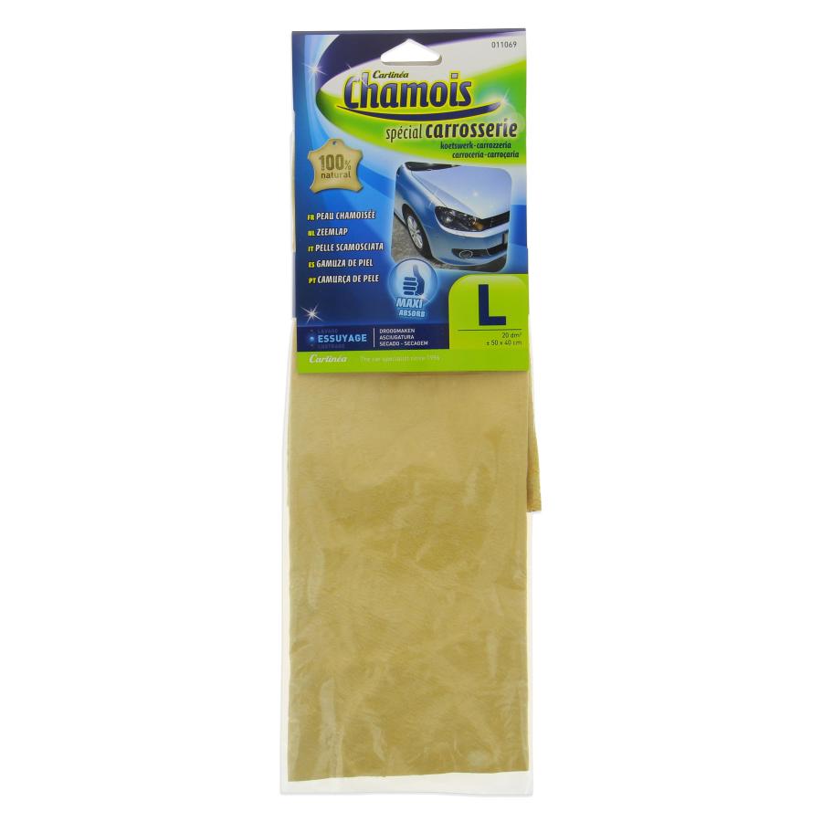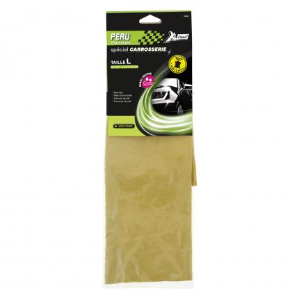 CARlinéa peau chamoisée CLASSIC taille L - 20 dm². Spécial carrosserie et vitres. Pour un essuyage / séchage complet de votre véhicule après rinçage. Finition optimale grâce à son grand pouvoir absorbant, sans trace. Peau 100% naturelle. Tannage 100% à l'huile de poisson pour une meilleure souplesse. Convient pour tout type de carrosserie. Dimensions : 50 x 40 cm environ - 20 dm² environ Composition : 100 % peau de mouton naturelle Utilisation : Avant toute opération, passer la peau chamoisée à l'eau claire et l'essorer. Passer la peau humide sur la surface à sécher. Dès que la peau est saturée d'eau, l'essorer, puis renouveler l'opération. Après chaque utilisation, bien rincer la peau à l'eau tiède, laisser sécher.