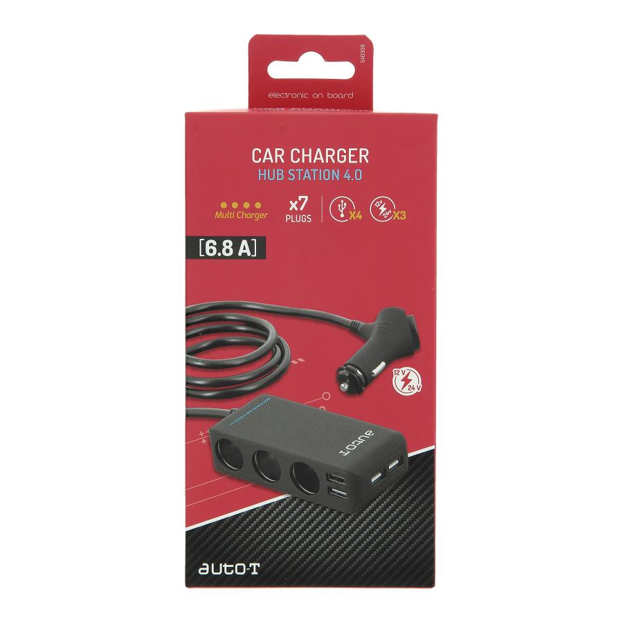 Chargeur multi-prises de voiture forte puissance 6.8A jusqu'a 7 appareils simultanément ! Affichage instantané du voltage, de la puissance disponible, interrupteur de sécurité + flash lumineux (si intensité de charge d appel trop forte), directement sur la prise allume cigare. Sortie 5V - 6,8A de capacité de charge. 4 USB avec sorties sécurisées de : 2.4A, 2.4A, 1A x2 3 Prises 12V/24V - puissance : 120W Câble rallonge de 1,10m