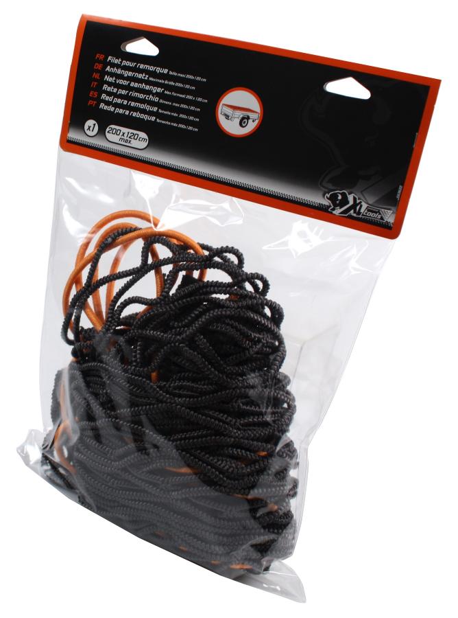 Filet pour remorque bagagère. Taille mini 150x110cm, taille maxi 200x120cm. Avec poignées de préhension.