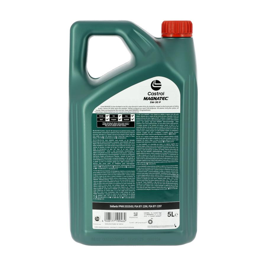 Castrol MAGNATEC s'accroche, se maintient et offre plus de 50% de protection en plus, contre l'usure du moteur*. Elle aide à la sauvegarde des composants vitaux du moteur en : Formant une barrière résistante entre les points de contact métal contre métal de l'arbre à cames Gérant les dépôts abrasifs sur les pistons, protégeant ainsi l'usure des chemises de cylindres Maintenant la tension de la chaîne de distribution et le synchronisme du moteur, minimisant l'endommagement et l'allongement de la chaîne Préservant les roulements du moteur de l'usure corrosive *Testée selon un test d'usure standard de l'industrie, mesuré par rapport aux limites de l'industrie* SPECIFICATIONS PSA Approval B71 2290 , PSA Approval B71 2297, STELLANTIS FPW9.55535/03 APPLICATION Castrol MAGNATEC 5W-30 P est homologué pour une utilisation dans les véhicules où un lubrifiant 5W-30 conforme aux normes PSA Approval B71 2290, PSA Approval B71 2297 et STELLANTIS FPW9.55535/03 est requis. Castrol MAGNATEC 5W-30 P est spécialement formulé pour les moteurs Stellantis et officiellement homologué FPW9.55535/03. Il adhère et se verrouille pour offrir des performances exceptionnelles en matière de protection contre l'usure et les dépôts lors des tests de spécifications. Castrol MAGNATEC 5W-30 P est homologué pour une utilisation dans les climats à haute température (HTC) où la norme PSA B71 2297 est requise.