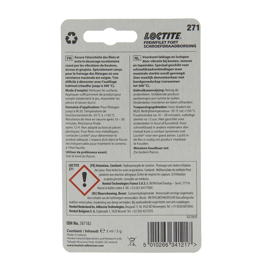 LOCTITE 271 Freinfilet rouge à base méthacrylate de résistance forte, faible viscosité, fluorescent sous lumière UV pour pouvoir être contrôlé. LOCTITE 271 est un freinfilet de couleur rouge à base méthacrylate avec une viscosité faible et une résistance élevée. Temps de fixation sur acier de 10 min, de 5 min sur laiton et de 15 min sur acier inoxydable. Idéal pour les applications où la migration de produit doit être évitée. Tolère une légère contamination par les huiles. Peut être utilisé sur tous les métaux. Couple de rupture de 26 Nm pour les diamètres maximum de M10. Fluorescence sous lumière UV. Freinage et étanchéité des goujons, vis et écrous. - Efficacité maximale sur assemblages soumis à des chocs - Produit très puissant, difficilement démontable, sur gros diamètres, pas de vis fins, engagement important - Désassemblage possible en chauffant à 300°C - Classification UL, MH8007 (faible danger d'incendie) - Fixation de goujons sur blocs moteurs, vis ou goujons de pont arrière et boîtes de vitesses, fixation de vis et d'écrous, etc.