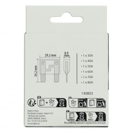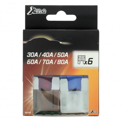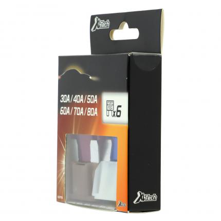 XLTECH Assortiment de 6 maxi fusibles. 30A / 40A / 50A / 60A / 70A / 80A Dimensions du fusible: 34 x 29 x 8,5 mm