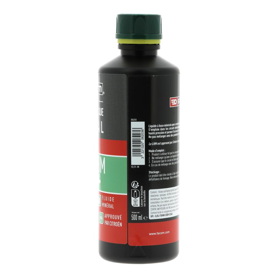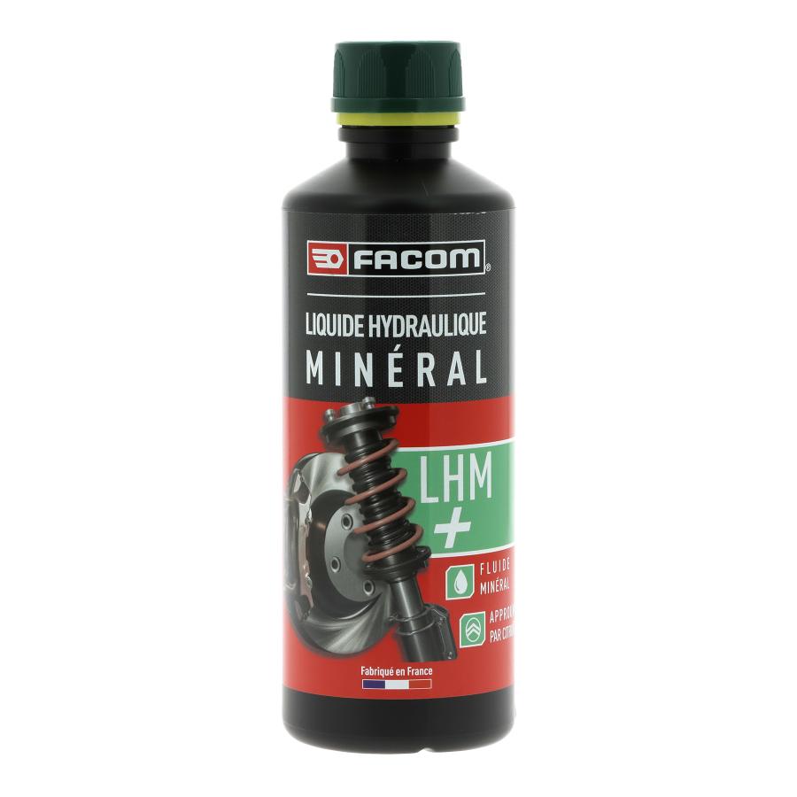 LIQUIDE DE FREINS FACOM LHM 500 ML DESCRIPTIF FONCTIONNEL - Liquide à base minérale pour centrales hydrauliques de véhicules Citroën. - S'emploie dans les circuits hydrauliques des véhicules Citroën à réserve centralisée de haute pression et permet d'assurer les fonctions de suspension de freinage et d'assistance. - Ne pas mélanger avec des produits d'origine synthétique : destruction des coupelles. DESCRIPTIF TECHNIQUE - Aspect : Liquide limpide, exempt de matières en suspension et sédiments de couleur vert fluorescent - Composition : Mélange d'huiles minérales, hydrocarbones synthétiques avec additifs - Propriété : Très bas point d'écoulement, point d'ébullition élevé évitant la formation de tampons vapeur, grande résistance à l'oxydation, anti corrosion, neutre vis à vis des élastomères spécialement choisis pour l'emploi du LHM. Produit répondant au cahier des charges Citroën et norme ISO7308 CARACTERISTIQUES PHYSICO-CHIMIQUE - Le LHM est approuvé par Citroën. Il répond aux spécifications suivantes fournies par le fabricant (valeur moyenne) : - Masse volumique : 0,835 à 0,850 kg/l à 20°C - Viscosité cinématique à 100°C : >6mm²/s - Viscosité cinématique à 40°C : >18mm² /s MODE D EMPLOI - Produit à utiliser tel quel en remplacement du produit ou en complément - Ne mélanger qu'avec un liquide du même type - S'assurer que le circuit est bien purgé - En cas de mélange avec des produits DOT3/DOT4 : Vidanger impérativement le circuit