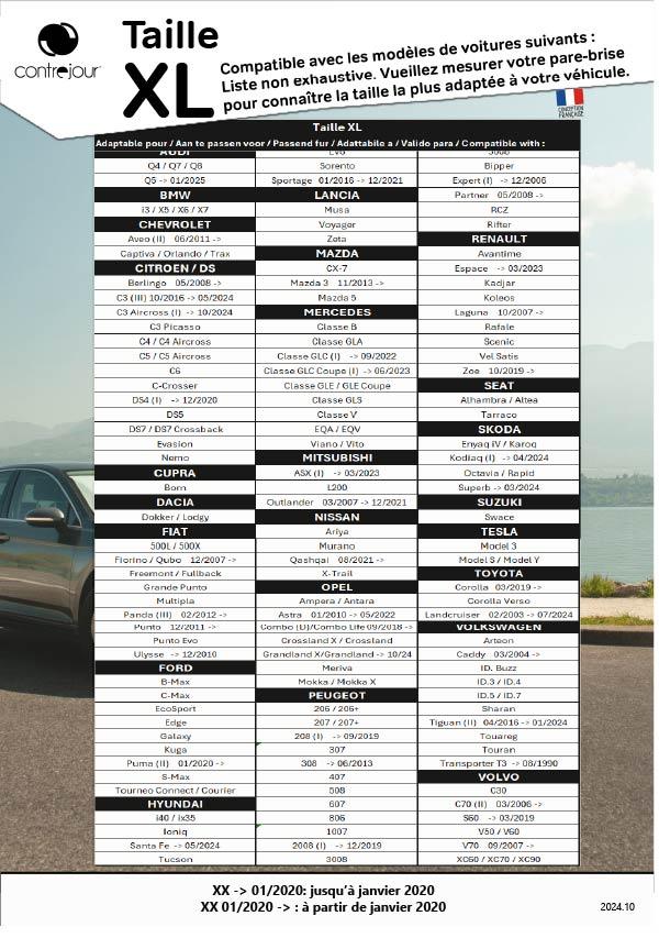 CONTREJOUR : un style épuré pour un écran réflecteur blanc ultra performant. Indispensable lors de vos stationnements, il protège efficacement des rayons du soleil et de la chaleur. Repliable et refermable grâce à un bouton pression, il est facile à ranger dans votre véhicule. Roulez dans une voiture tempérée et plus confortable. Attention : ce pare-soleil ne doit pas être utilisé lors de vos déplacements. Il est uniquement destiné à être utilisé à l'arrêt. Le décor blanc du pare-soleil doit être placé contre le pare-brise, décor visible de l'extérieur de votre véhicule. Attention : les produits d'entretien automobile (ex : nettoyant cuir, brillant pour plastiques, etc...) peuvent dégrader le décor du pare-soleil. Taille XL / dimensions : 140x80cm. Veuillez mesurer votre pare-brise pour connaître la taille la plus adaptée à votre véhicule. Voir liste des modèles compatibles : cf. packaging. Liste non exhaustive.