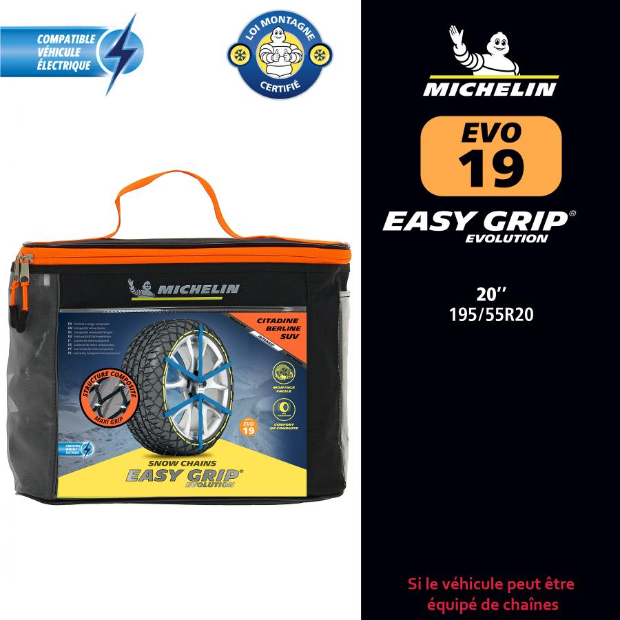 MICHELIN Easy Grip EVOLUTION est une chaîne à neige haute performance en matériaux composites, facile à manipuler. -Sa structure exclusive assure une motricité maximale sur neige et verglas en traction, propulsion, virage et freinage. EVOLUTION : système de fermeture extensible pour faciliter le montage. -Particulièrement adaptées aux véhicules avec passages de roue réduits. -Utilisation sur routes enneigées à vitesse modérée (vitesse maximale 40 km/h). -Visibilité plus : équipé du système réfléchissant NVS « Night Vision Security » de Michelin qui accroît la visibilité nocturne latérale du véhicule. Recommandations : -Pour tous véhicules de tourisme chaînables. Compatible avec les dispositifs ABS, ESP. -Se reporter au manuel du constructeur pour s'assurer que le véhicule est bien chaînable. -Monter les chaînes à neige toujours par paire sur un essieu, au moins sur les roues motrices (traction ou propulsion). -Pour les véhicules 4x4 (4 roues motrices), installation sur les roues motrices directrices et idéalement sur les 4 roues. Contenu: 1 paire de chaînes à neige composite, 1 paire de gants de montage à manches longues, 1 Notice plastifiée servant de tapis de montage. Homologué en France et en Italie. -Conforme à la réglementation française : Arrêté ministériel des Transports du 18 juillet 1985 : « DISPOSITIFS ANTIDÉRAPANTS ÉQUIPANT LES PNEUMATIQUES ». Conforme à la norme EN16662-1 Conforme à la réglementation Suisse Compatible véhicule électrique