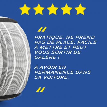MICHELIN SOS GRIP® EVOLUTION, des Chaussettes à neige Textile Hautes performances et facile à installer. La nouvelle structure textile exclusive MICHELIN procure aux automobilistes une excellente adhérence, une motricité maximale et une facilité de montage, sans effort, en moins de deux minutes. Grâce à la mise au point de Multi bandes Textiles Ultra-absorbantes, la performance des chaussettes SOS GRIP® EVOLUTION augmente de +50% sur neige au démarrage. La bande de roulement en polyester haute résistante permet au produit de pouvoir être réutilisé sur plusieurs saisons. Également compatible avec les dispositifs ESP et ABS, cette chaussette à neige n'engendre aucune vibration lors de la conduite. MICHELIN SOS GRIP® EVOLUTION est un dispositif particulièrement adapté pour une utilisation d'urgence sur route enneigée, sur une courte distance et à une vitesse maximale de 50km/h. Adaptées également pour les véhicules avec passages de roue réduits. Grâce à son sac ultra compact, les chaussettes SOS GRIP® EVOLUTION seront toujours à porter de main. Conforme à la réglementation française : Arrêté ministériel des Transports du 18 juillet 1985 : «DISPOSITIFS ANTIDÉRAPANTS ÉQUIPANT LES PNEUMATIQUES» Il est important de vérifier dans le manuel du constructeur automobile, la chaînabilité de votre véhicule avant de vous équiper. Conforme à la norme EN16662-1 Compatible véhicule électrique