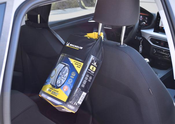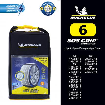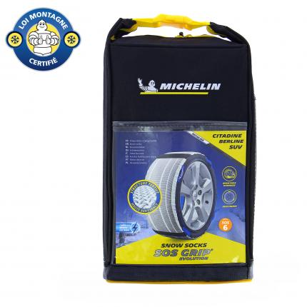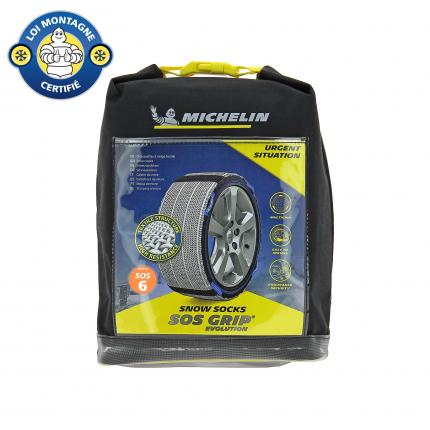 MICHELIN SOS GRIP® EVOLUTION, des Chaussettes à neige Textile Hautes performances et facile à installer. La nouvelle structure textile exclusive MICHELIN procure aux automobilistes une excellente adhérence, une motricité maximale et une facilité de montage, sans effort, en moins de deux minutes. Grâce à la mise au point de Multi bandes Textiles Ultra-absorbantes, la performance des chaussettes SOS GRIP® EVOLUTION augmente de +50% sur neige au démarrage. La bande de roulement en polyester haute résistante permet au produit de pouvoir être réutilisé sur plusieurs saisons. Également compatible avec les dispositifs ESP et ABS, cette chaussette à neige n'engendre aucune vibration lors de la conduite. MICHELIN SOS GRIP® EVOLUTION est un dispositif particulièrement adapté pour une utilisation d'urgence sur route enneigée, sur une courte distance et à une vitesse maximale de 50km/h. Adaptées également pour les véhicules avec passages de roue réduits. Grâce à son sac ultra compact, les chaussettes SOS GRIP® EVOLUTION seront toujours à porter de main. Conforme à la réglementation française : Arrêté ministériel des Transports du 18 juillet 1985 : «DISPOSITIFS ANTIDÉRAPANTS ÉQUIPANT LES PNEUMATIQUES» Il est important de vérifier dans le manuel du constructeur automobile, la chaînabilité de votre véhicule avant de vous équiper. Conforme à la norme EN16662-1 Compatible véhicule électrique