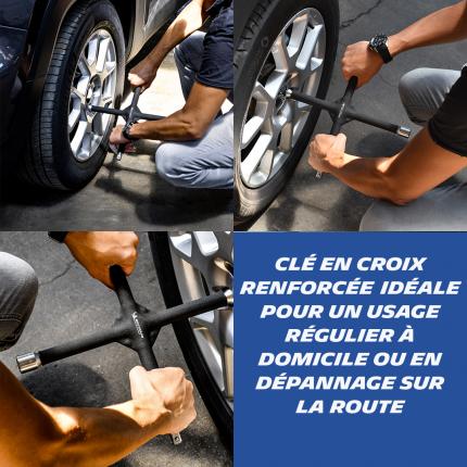 Clé en croix démonte-roue, renforcée. Taille : 17/19/21mm et carré 1/2'. Revêtement mousse antiglisse pour plus de confort d'utilisation. Acier inoxydable haute qualité.