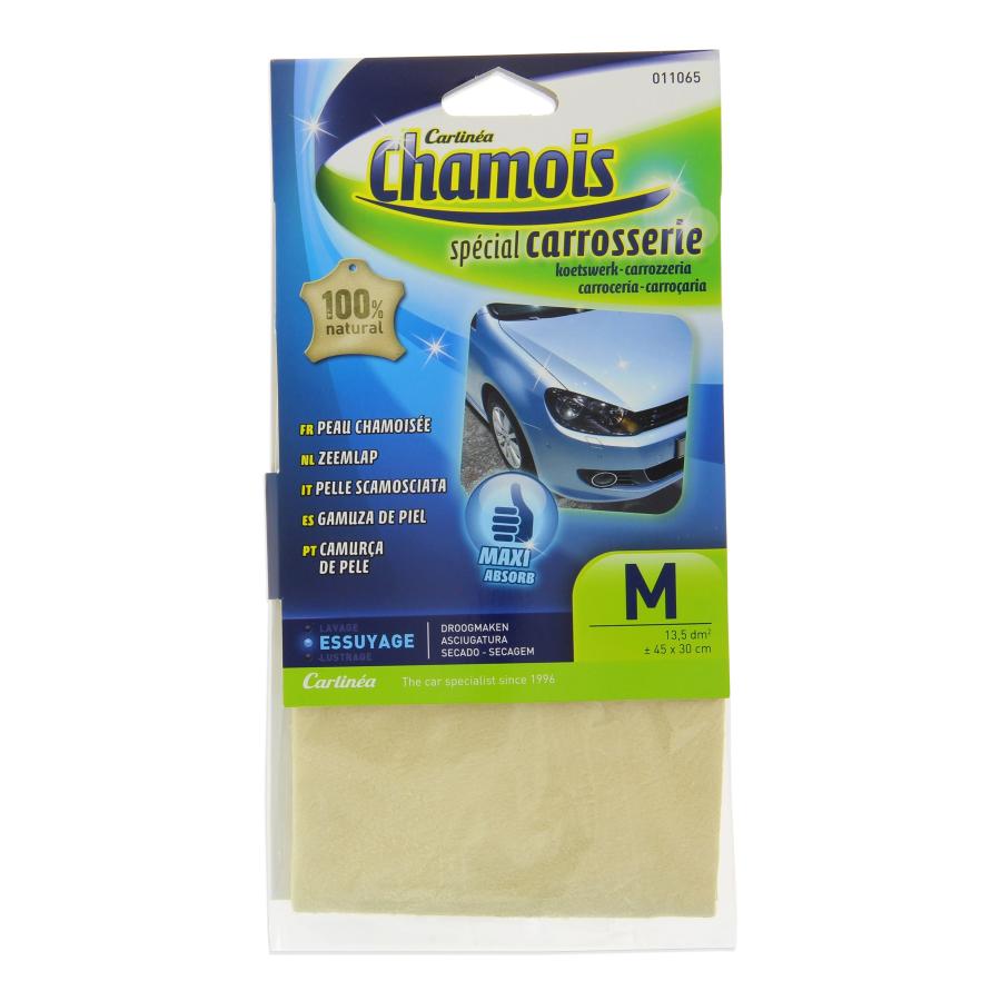 CARlinéa peau chamoisée CLASSIC taille M - 13.5 dm² Spécial carrosserie et vitres. Pour un essuyage complet de votre véhicule après rinçage. Finition optimale grâce à son grand pouvoir absorbant, sans trace. Peau 100% naturelle. Tannage 100% à l'huile de poisson pour une meilleure souplesse. Convient pour tout type de carrosserie. Dimensions : 45x30 cm environ, 13.5 dm² environ. Composition : 100 % peau de mouton naturelle Utilisation : Avant toute opération, passer la peau chamoisée à l'eau claire et l'essorer. Passer la peau humide sur la surface à sécher. Dès que la peau est saturée d'eau, l'essorer, puis renouveler l'opération. Après chaque utilisation, bien rincer la peau à l'eau tiède, laisser sécher.