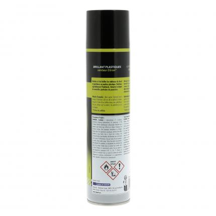 Ce brillant plastique nettoie, et fait briller les tableaux de bord et garnitures en matière plastique. Parfume agréablement l'habitacle. Retarde le dépôt de nouvelles particules de poussière. - Redonne l'éclat du neuf aux surfaces traitées. - Formule anti-statique. - Efficacité instantanée. - Parfumé au citron Aérosol 400 ml. Mode d'emploi : Bien agiter l'aérosol avant emploi. Pulvériser à 20 cm de la surface à traiter. Essuyer à l'aide d'un chiffon doux, non pelucheux. Ne pas utiliser sur le volant, les pédales ou les sièges.