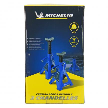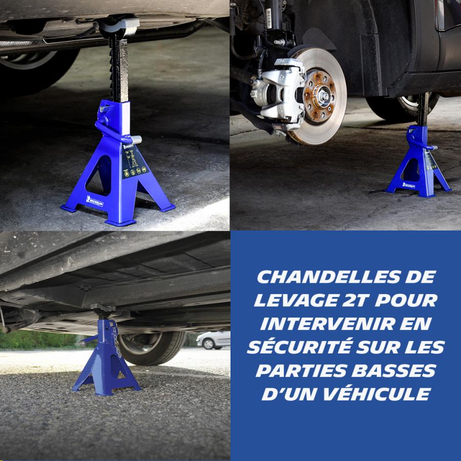 Chandelles à crémaillère pour porter jusqu'à 2 Tonnes. Hauteur de blocage 280 à 415mm. Blocage facile et rapide par un levier + goupille de sécurité. Pieds larges pour une meilleure stabilité. Semelle de protection caoutchouc. Boîte de 2 pièces.