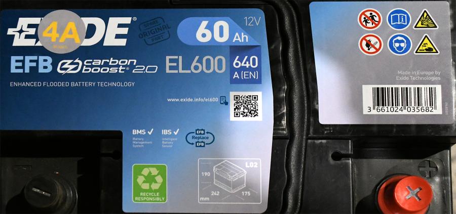 - Batterie de voiture Exide EL600 EFB 12V 60Ah 640A L02