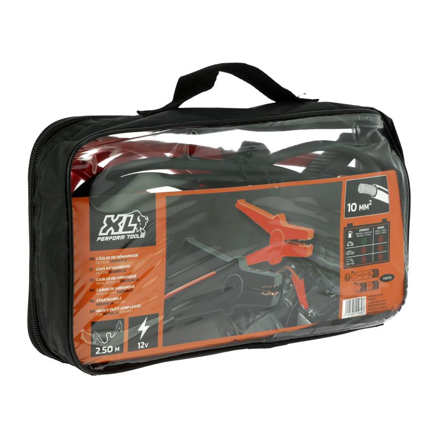 2 câbles de démarrage 10 mm² de longueur 2.80m spécialement conçus pour des véhicules essence de petite cylindrée Pinces de branchement entièrement isolées pour une qualité et une sécurité optimale. Sacoche de rangement fournie Section des câbles : 10mm² Longueur des câbles : 2,80m