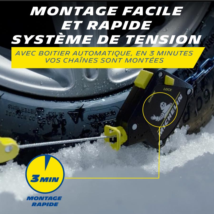 CHAÎNES A NEIGE A TENSION AUTOMATIQUE 7mm. Spécialement conçues pour équiper certains véhicules dits non-chaînables* ou à chaînage particulier* (passage de roue réduit, ou taille basse). Maillons de 7mm pour un encombrement réduit. Convient également aux véhicules chainables. Tension automatique : Montage rapide et sécurisé sans déplacer le véhicule, et sans retendre la chaîne en cours de roulage. Hautes performances : Bande de roulement asymétrique pour des performances maximales en traction, propulsion, virage et freinage sur neige. Butées de protection de jantes et enjoliveurs. Système réfléchissant Night Vision Security. Chaînes à neige compatible pour véhicule électrique Recommandations : Utiliser sur des pneumatiques en bon état, recommandés par le constructeur et dont les dimensions figurent sur l étiquette d affectation du produit. Utilisation pour véhicules de tourisme uniquement. Il est impératif de bien respecter les précautions d utilisation et les instructions de montage et de démontage fournies à l intérieur de ce sac de rangement. CONSEIL ! Pour votre confort, et votre sécurité, entraînez-vous au montage avant utilisation *Compatibilité : Couverture de 80% des modèles de véhicules dits « Non-Chainables » du parc roulant Français. Se reporter au manuel du constructeur pour vérifier si votre véhicule peut être équipé avec ce produit, pour votre taille de pneu.