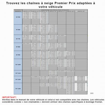 Chaînes à neige métalliques à croisillons en X, taille 90. Tension manuelle. Mise en place sans déplacer le véhicule. Maillons 9mm en acier haute résistance anticorrosion. Conditionnées en boite plastique blanche contenant 1 paire de gants, 1 notice d'utilisation et maillons de rechange. Rappel des affectations sur la boite. B26 Conforme Homologation EN1662-1:2020 Certification n° 288-20652 ONORM V5117:2021