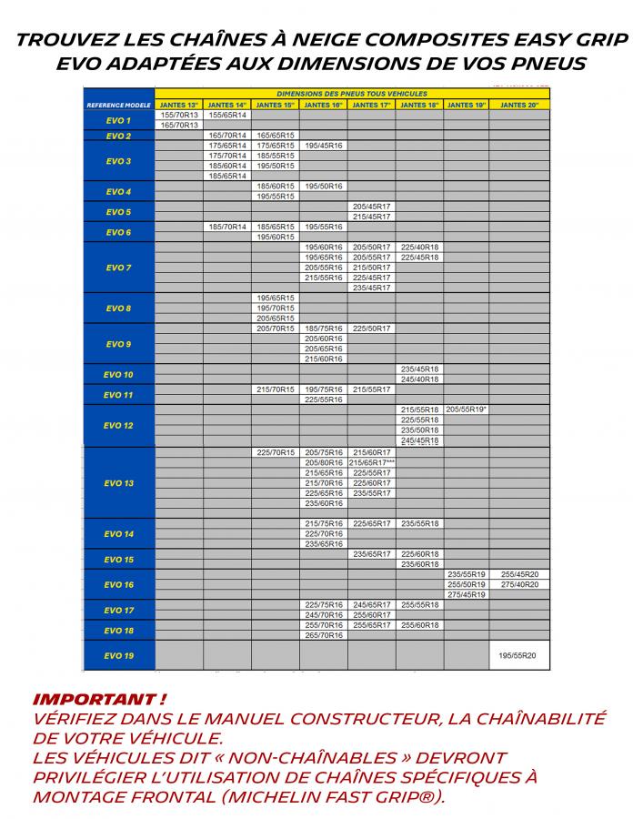 MICHELIN Easy Grip EVOLUTION est une chaîne à neige haute performance en matériaux composites, facile à manipuler. -Sa structure exclusive assure une motricité maximale sur neige et verglas en traction, propulsion, virage et freinage. EVOLUTION : système de fermeture extensible pour faciliter le montage. -Particulièrement adaptées aux véhicules avec passages de roue réduits. -Utilisation sur routes enneigées à vitesse modérée (vitesse maximale 40 km/h). -Visibilité plus : équipé du système réfléchissant NVS « Night Vision Security » de Michelin qui accroît la visibilité nocturne latérale du véhicule. Recommandations : -Pour tous véhicules de tourisme chaînables. Compatible avec les dispositifs ABS, ESP. -Se reporter au manuel du constructeur pour s'assurer que le véhicule est bien chaînable. -Monter les chaînes à neige toujours par paire sur un essieu, au moins sur les roues motrices (traction ou propulsion). -Pour les véhicules 4x4 (4 roues motrices), installation sur les roues motrices directrices et idéalement sur les 4 roues. Contenu: 1 paire de chaînes à neige composite, 1 paire de gants de montage à manches longues, 1 Notice plastifiée servant de tapis de montage. Homologué en France et en Italie. -Conforme à la réglementation française : Arrêté ministériel des Transports du 18 juillet 1985 : « DISPOSITIFS ANTIDÉRAPANTS ÉQUIPANT LES PNEUMATIQUES ». Conforme à la norme EN16662-1 Conforme à la réglementation Suisse Compatible véhicule électrique