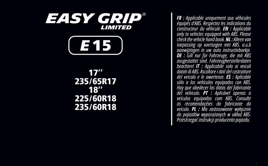 Les chaînes composites EASY GRIP LIMITED s adressent aux véhicules chainables. Une paire de gant à manche longue est fournie avec une notice plastifiée servant de tapis lors du montage. Ces chaînes se montent comme des chaussettes à neige. Le système de fermeture extensible permet une mise en place très facile et sans forcer. Grâce à sa structure composée d aramide couvert d un tressage en polyamide et recouvert de polyuréthane, cet alliage procure aux chaînes une résistance maximum. De plus, 150 anneaux en acier galvanisé procurent une motricité et un grip optimal sur neige et verglas surtout pour les véhicules à fort couple. Les avantages de ce dispositif sont: Un montage et démontage intuitif Une conduite sans vibration Un produit ultra résistant Un produit adapté aux véhicules ayant des passages de roues réduits Ne raye pas les jantes Se reporter au manuel du constructeur pour s'assurer que le véhicule est bien chaînable. Conforme à la norme EN16662-1