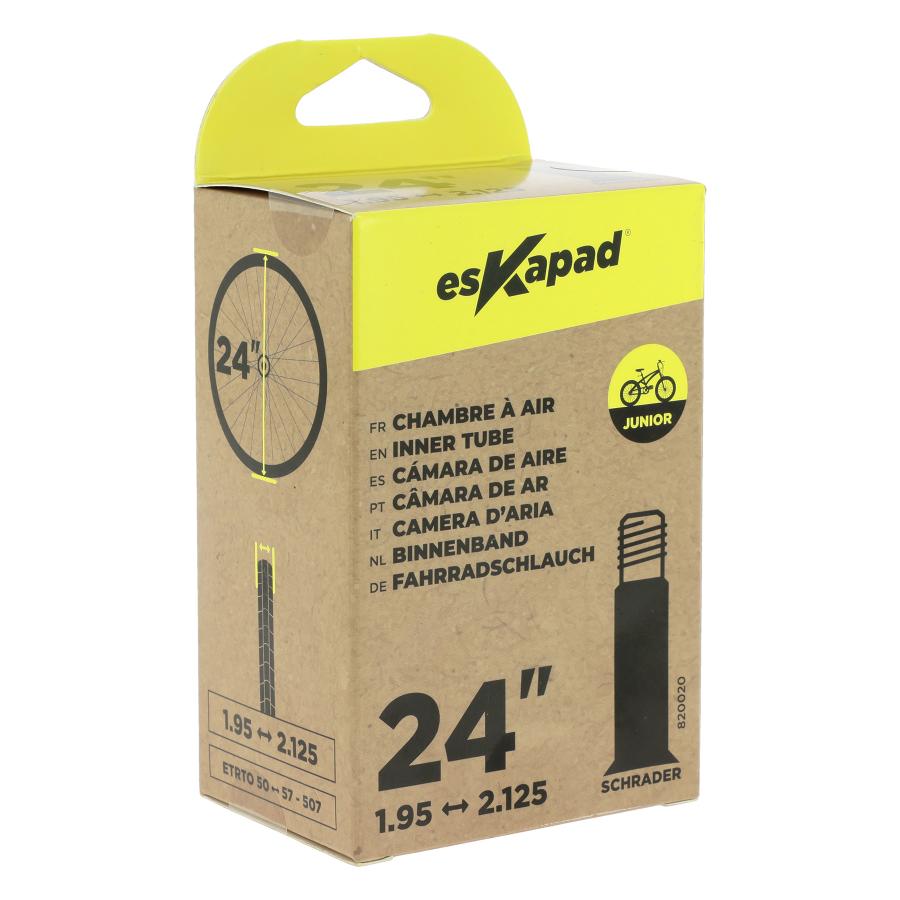 La chambre à air esKapad est conçue pour les vélos junior avec roues de diamètre 24 pouces. Adaptable sur des sections de 1,95 à 2,125 avec une valve schrader. ETRTO 50 - 57 - 507 Matériaux : 100% butyl caoutchouc. EsKapad est une marque française, créée et développée par deux passionnés de vélo. C'est en Isère, proche des montagnes que cette collection voit le jour et vous propose d'allier évasion, liberté, détente, tout en assurant votre sécurité et vos réparations.