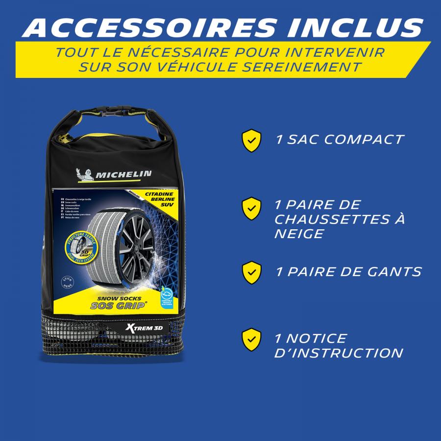 SOS GRIP XTREM 3D Aderenza estrema firmata Michelin Preparati ad affrontare l inverno con un innovazione pensata per la tua sicurezza. SOS GRIP XTREM 3D garantisce una trazione superiore grazie a una tecnologia avanzata, anche sulle strade più scivolose. - Tecnologia Dual Tech System: Struttura tessile INNOVATIVA in rilievo 3D AD ALTE PRESTAZIONI per un aderenza eccellente e una trazione ECCEZIONALE su neve e ghiaccio. - Fibre ultra-assorbenti di nuova generazione: eliminano istantaneamente la sottile pellicola d acqua tra il pneumatico e la strada, GARANTENDO una presa OTTIMALE. - Guida confortevole: Senza vibrazioni per una marcia fluida e piacevole. - Installazione rapida e intuitiva, anche in condizioni difficili. - Durata prolungata: Il battistrada in poliestere ad alta resistenza assicura il riutilizzo per più stagioni. - SOS GRIP XTREM 3D: Perché prestazioni e sicurezza non accettano compromessi. Certificato secondo la norma europea EN16662-1:2020. Conforme al decreto ministeriale francese dei trasporti del 18 luglio 1985: 'DISPOSITIVI ANTISDRUCCIOLO PER PNEUMATICI.' Contenuto: 1 paio di calze da neve in tessuto, 1 paio di guanti, 1 manuale d uso. Compatibile con veicoli elettrici. Adatto anche per veicoli con passaruota ridotti.