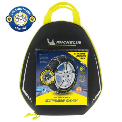 Coppia di catene da neve omologate con traverse asimmetriche per un'efficienza ottimale in trazione, in curva e in frenata. Maggiore visibilità : Extrem Grip® è equipaggiato con il sistema riflettente NVS -Night Vision Security- di Michelin, che aumenta la visibilità notturna laterale del veicolo. Catene a maglie quadrate da 9 mm brevettate. Tensione autobloccante. Chiusura piatta e girevole. Marcatori di colore per facilità di montaggio. Fornito con 2 maglie di ricambio, un paio di guanti a maniche lunghe, istruzioni di montaggio plastificate a uso tappeto e un manuale utente. Confezionate in una custodia antiurto con 2 scomparti interni per contenere le 2 catene separate ed evitare l'intreccio.