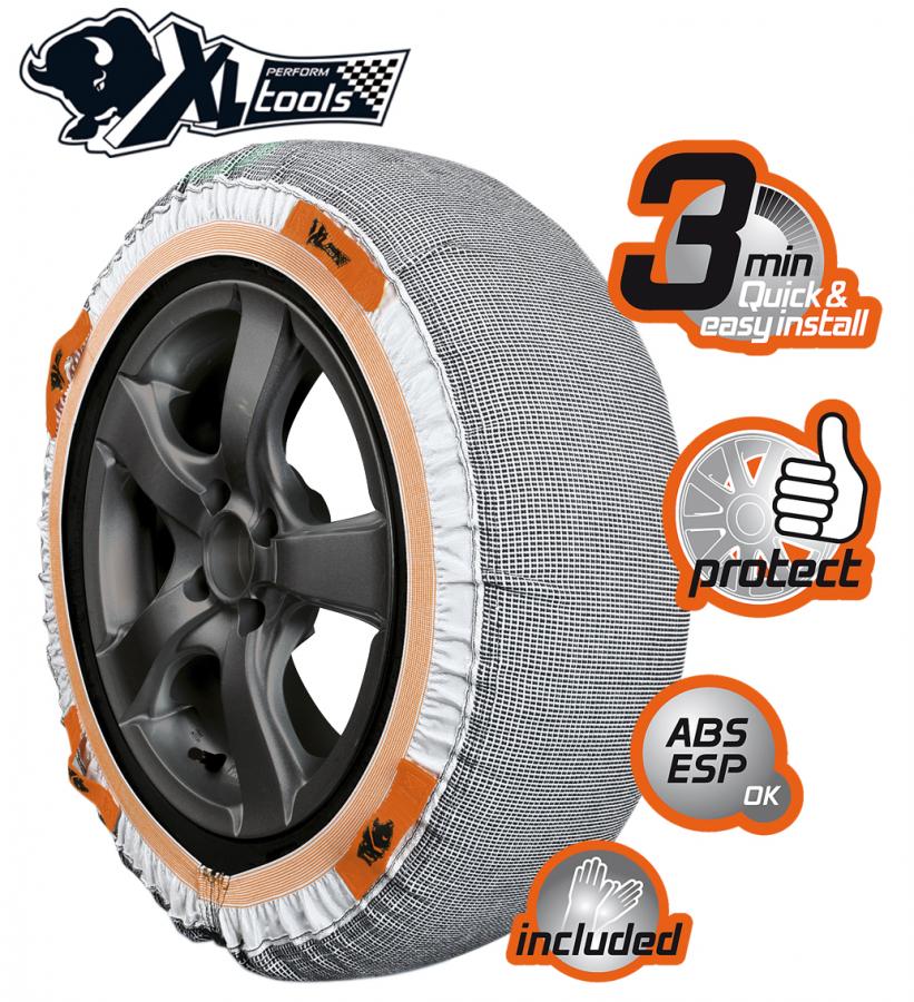 Catene da neve TESSILE alte performance XL Perform Tools. - rapide e facili da installare e smontare - particolarmente adatte ai veicoli con passaggi di ruota ridotti. - struttura TESSILE esclusiva e brevettata, che procura un buon livello di aderenza su ghiaccio e neve. - dispositivo particolarmente adatto per un uso d'emergenza su corta distanza ed a una velocità massima di 40 km/h. Contenuto della borsa : 1 paio di catene tessile, 1 paio di guanti, istruzioni per l'uso. Per veicoli fino a 2T massimo. Calze da neve equiparabili alle catene da neve in conformità alla normativa europea EN 16662-1:2020. 10 misure diverse.