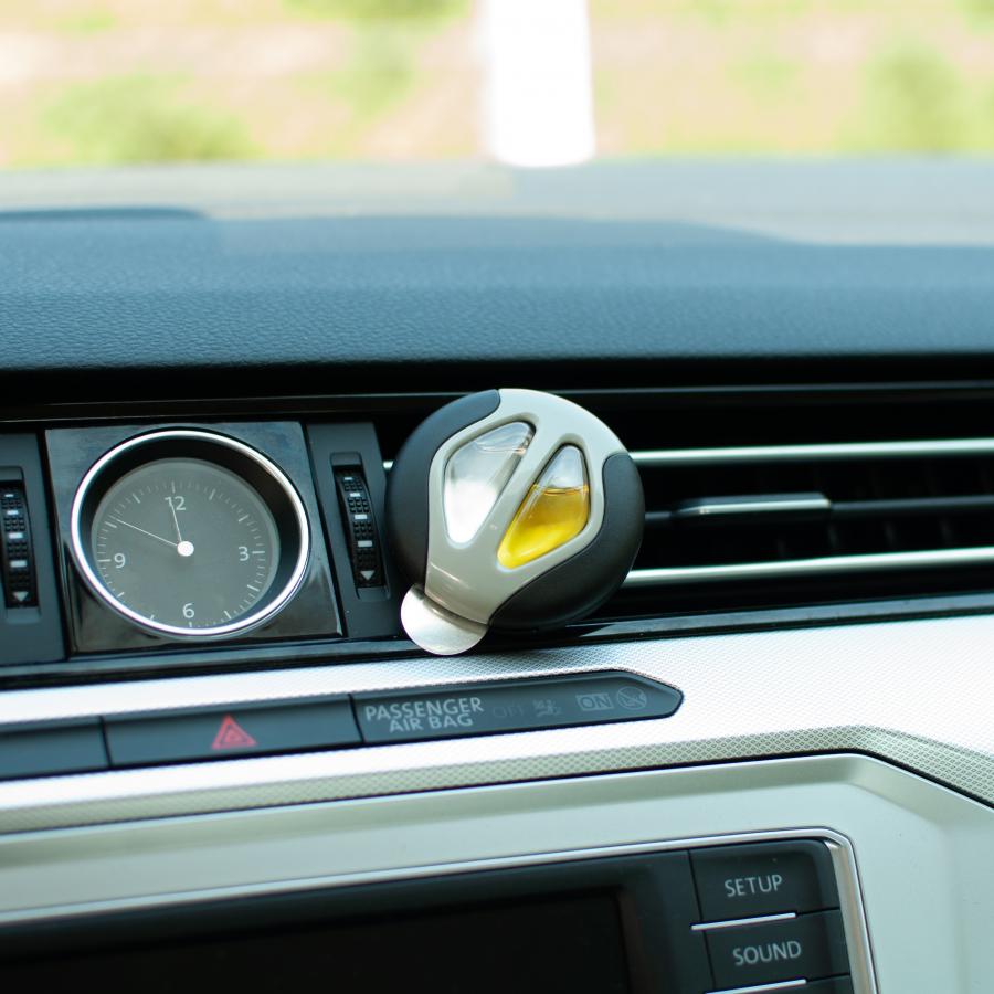 Deodorante diffusore per auto. Elegante e delicato. Capienza 2,5ml, durata 30 giorni. Si fissa sulle bocchette dell'aria. Profumi Vaniglia e odor stop