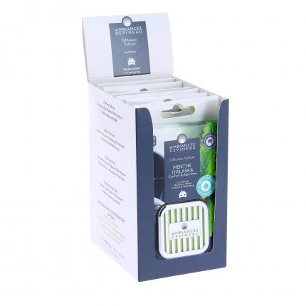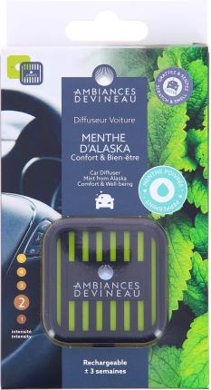 Una fragranza originale e discreta per il tuo veicolo, grazie al diffusore AMBIANCES DEVINEAU da agganciare all'aeratore. Durata +/- 3 settimane. Fragranza Alaska Mint: intensità 2/5. Arricchito con olio essenziale di menta piperita, noto per fornire comfort e benessere in macchina. Fatto in Italia. Confezione con adesivo tester. Unità di vendita: 6 pezzi, con combinazione di 3 diffusori colorati nero opaco + 3 diffusori colorati effetto cromo.