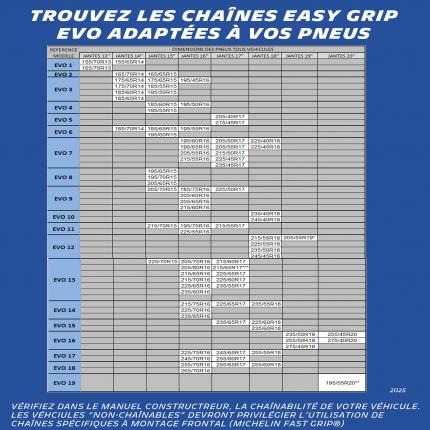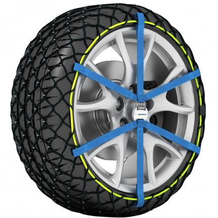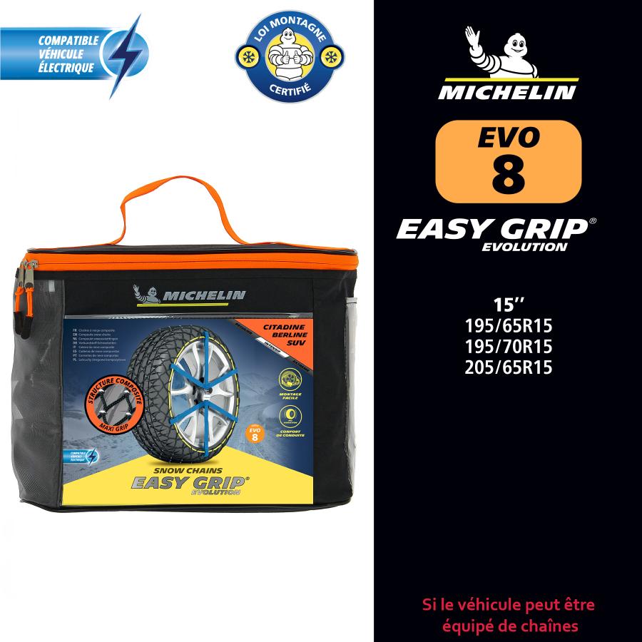 2 catene da neve composite OMOLOGATE IN FRANCIA E IN ITALIA (decreto ministeriale del 10 maggio 2011 emanato dal Ministero delle Infrastrutture e dei trasporti relativamente alle norme per i dispositivi supplementari di aderenza). MICHELIN Easy Grip EVOLUTION® è una catena da neve alta performanza in materiale composito, facile da utilizzare. La sua struttura esclusiva assicura una motricità ottimale su neve e ghiaccio, in trazione, propulsione, frenata e in curva. EVOLUTION : sistema di chiusura estensibile per facilitare il montaggio. Specialmente concepita per un uso su strade innevate a velocità moderata (velocità massima 40km/h). UTILIZZABILE ESCLUSIVAMENTE SU AUTOVETTURE CATENABILI Particolarmente adatte ai veicoli con passaggio ruote ridotto.