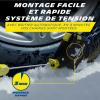 CATENE DA NEVE A TENSIONE AUTOMATICA 7mm. Appositamente progettato per alcuni veicoli non catenabili* o con concatenamento particolare* (passaruota ridotto o ribassato). Maglie da 7 mm per un ingombro ridotto. Adatto anche per veicoli catenabile. Tensione automatica : montaggio rapido e sicuro senza spostare il veicolo e senza ritensionare la catena durante la guida. Alte prestazioni : battistrada asimmetrico per massime prestazioni in trazione, propulsione, curva e frenata su neve. Arresti protettivi cerchione e copricerchi. Sistema riflettente di sicurezza per la visione notturna. Catene da neve compatibili con veicoli elettrici Raccomandazioni: Utilizzare su pneumatici in buone condizioni, consigliati dal produttore e le cui dimensioni figurano sull'etichetta di assegnazione del prodotto. Utilizzazione solo per veicoli privati. È imperativo seguire attentamente le precauzioni d'uso e le istruzioni di montaggio e smontaggio fornite all'interno di questa custodia. CONSIGLIO ! Per il vs comfort e sicurezza, esercitatevi nell'assemblaggio prima dell'uso *Compatibilità: Copertura dell'80% dei modelli di veicoli 'Non catenabili' del parco circolante francese. Consultare il manuale del produttore per verificare se il vs veicolo può essere equipaggiato con questo prodotto, per le dimensioni dei vs pneumatici.