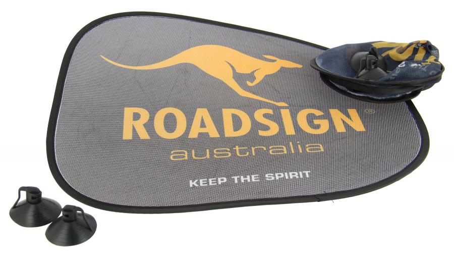 Proteggi il tuo cockpit del sole con lo spirito ROADSIGN Per il comfort dei tuoi passeggeri, queste 2 tendine proteggono senza occultare la visibilità. 4 ventose sicurizzate multiposizione Forma standard (B) Dimensioni 44 x 36 cm Pieghevoli con movimento di torsione