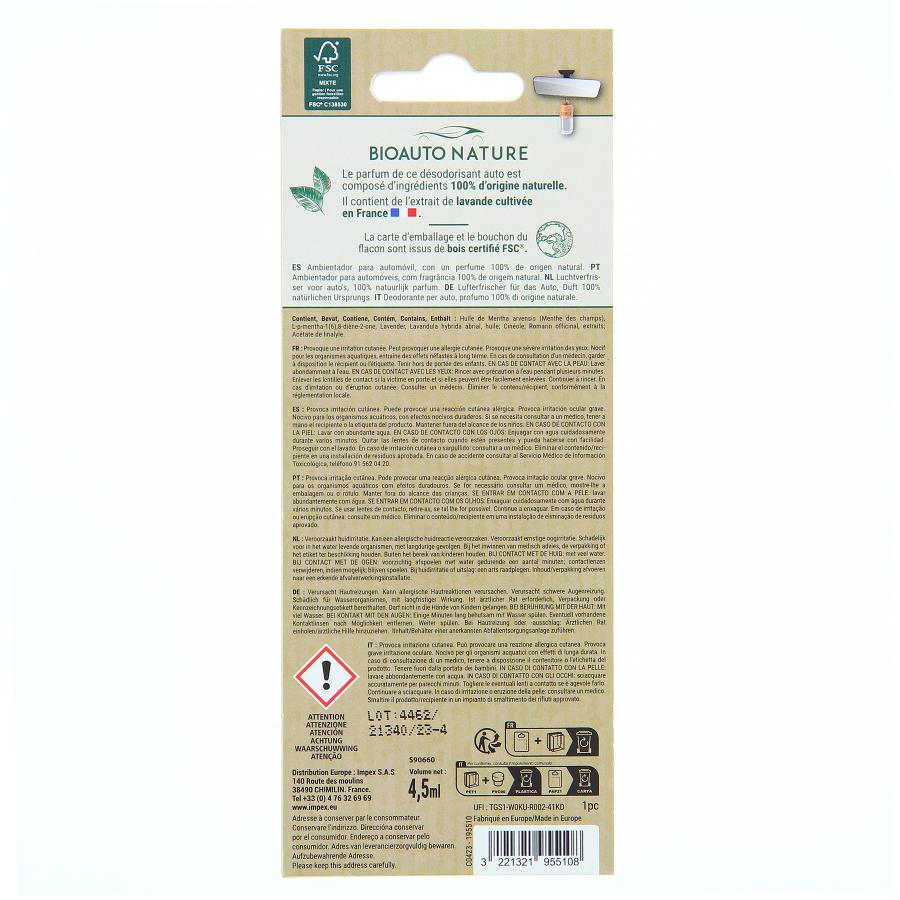 Deodoranti BIO AUTO NATURE 100% naturali per la tua auto : Profumi realizzati con 100% di materie prime di origine naturale + Più dell 80% biodegradabile Olio essenziale certificato BIOLOGICO Profumi sviluppati e qualificati in Francia dall esperto profumiere GIVAUDAN Legno e cellulosa certificati FSC Confezione in carta riciclata e certificata FSC Vetro riciclabile Vasetto con tappo legno da appendere. Volume netto : 4.5 ml