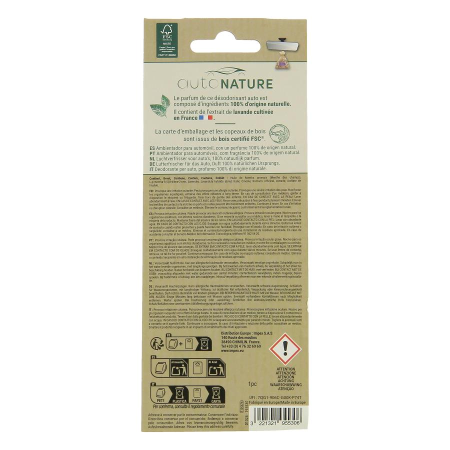 Sacchetto di trucioli di legno da appendere. La gamma di deodoranti per auto Bio Auto Nature è una gamma ecologica con profumi naturali al 100% per la tua auto. La fragranza di questo deodorante per auto è stata sviluppata in Francia. I suoi ingredienti sono 100% di origine naturale e 100% biodegradabili (secondo i metodi OECD 301-302-310). Contiene estratto di lavanda coltivato in Francia e olio essenziale di limone biologico. La carta di imballaggio e i trucioli di legno sono realizzati con legno certificato FSC®.