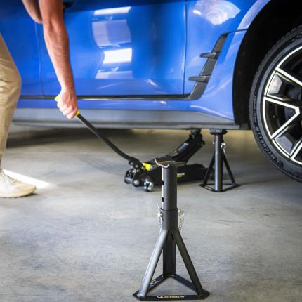 Kit di sollevamento: 1 martinetto da 1,8 tonnellate + 1 coppia di cavalletti fissi da 2 tonnellate 1 martinetto idraulico a ruote. Capacità di sollevamento: 1800 kg Altezza di sollevamento: da 105 mm a 350 mm. Maniglia di sollevamento ergonomica. Stabilità ottimale. Spazio per riporre i dadi. Maniglia di trasporto ergonomica. Base universale in gomma. Ruote girevoli per una facile manovrabilità. 1 coppia di cavalletti Capacità: 2000 kg Altezza di sollevamento: da 266 a 355 mm Strumenti essenziali per lavorare in sicurezza sulle parti inferiori di un veicolo quando si utilizza il martinetto.