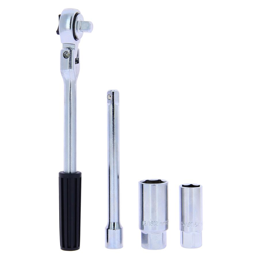 Chiave per candele per motore a benzina, con cricchetto articolato. Composizione: 1 cricchetto lungo. 200 mm 1 prolunga lunghezza 145 mm 1 presa da 16 mm con quadrato da 3/8'. 1 presa da 21 mm con quadrato da 3/8'. Chiave a cricchetto per candele con bussole da 16 e 21 mm. Smontaggio: - Pulire intorno alla candela da rimuovere - Svitare in senso antiorario - Verificare la regolazione della candela utilizzando un set di spessimetro Montaggio: - Iniziare ad avvitare a mano, quindi bloccare la candela alla coppia di serraggio consigliata (vedi manuale del veicolo) - Avvertenza: una coppia di serraggio eccessiva non garantisce una migliore tenuta. - Candela a sede conica: serrare al massimo 1/16 di giro - Candela con guarnizione: serrare al massimo 1/4 di giro