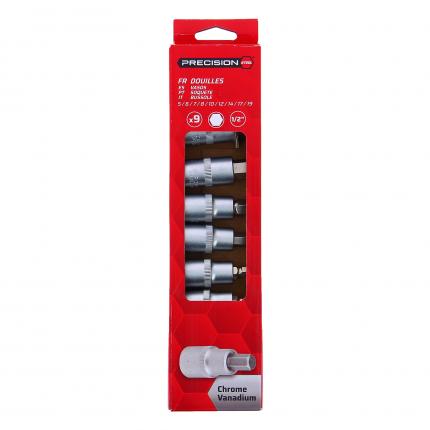Set di 9 bussole esagonali maschi 1/2' : 5 / 6 / 7 / 8 / 10 / 12 / 14 / 17 e 19 - In cromo vanadio di tipo professionale.