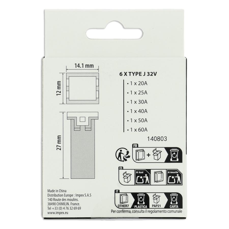Assortimento XLTECH di 6 fusibili tipo J 20A / 25A / 30A / 40A / 50A / 60A Dimensioni del fusibile: 14,1 mm (lunghezza) x 12 mm (larghezza) x 27 mm (altezza)