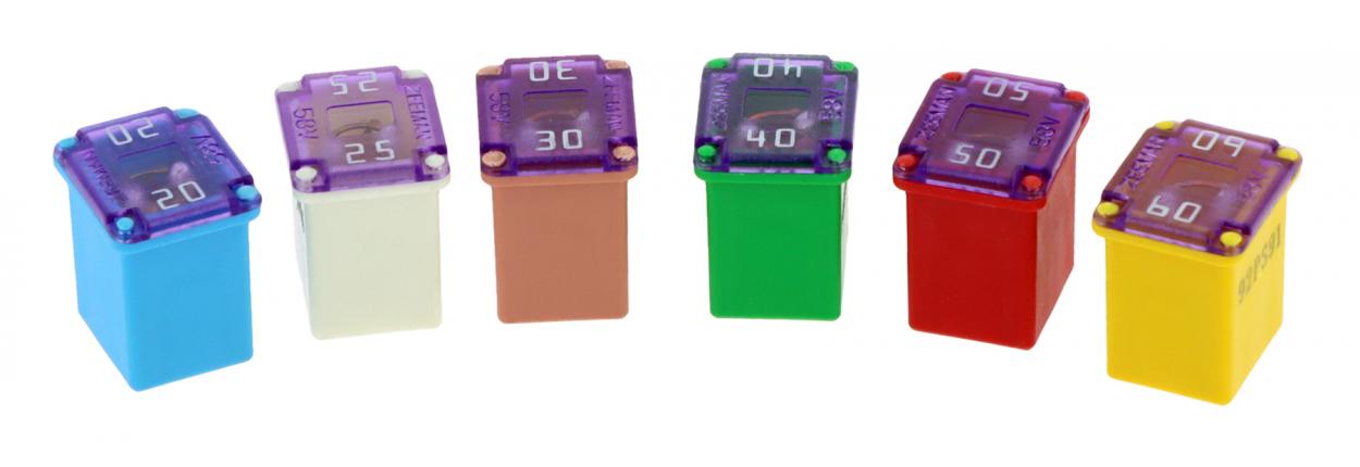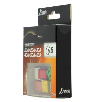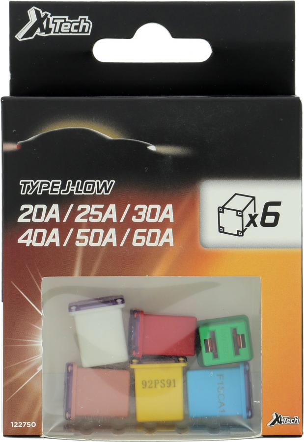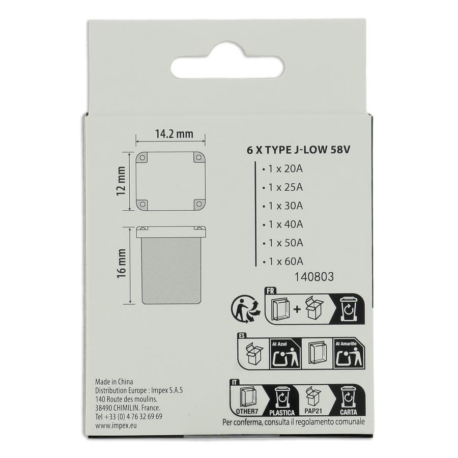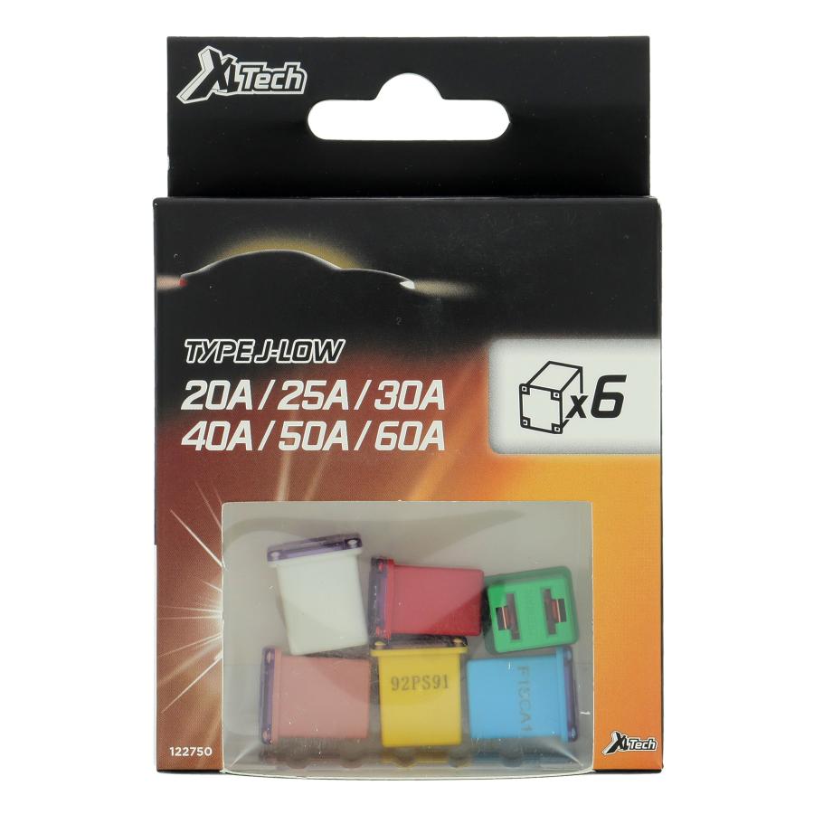 Assortimento XLTECH di 6 fusibili tipo J - Bassa corrente nominale 20 A / 25 A / 30 A / 40 A / 50 A / 60 A Dimensioni del fusibile: 14,2 mm (lunghezza) x 12 mm (larghezza) x 16 mm (altezza)