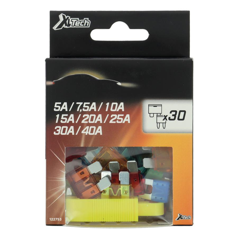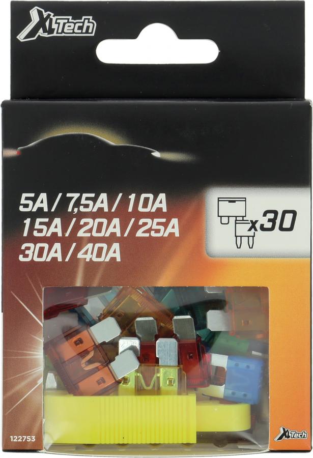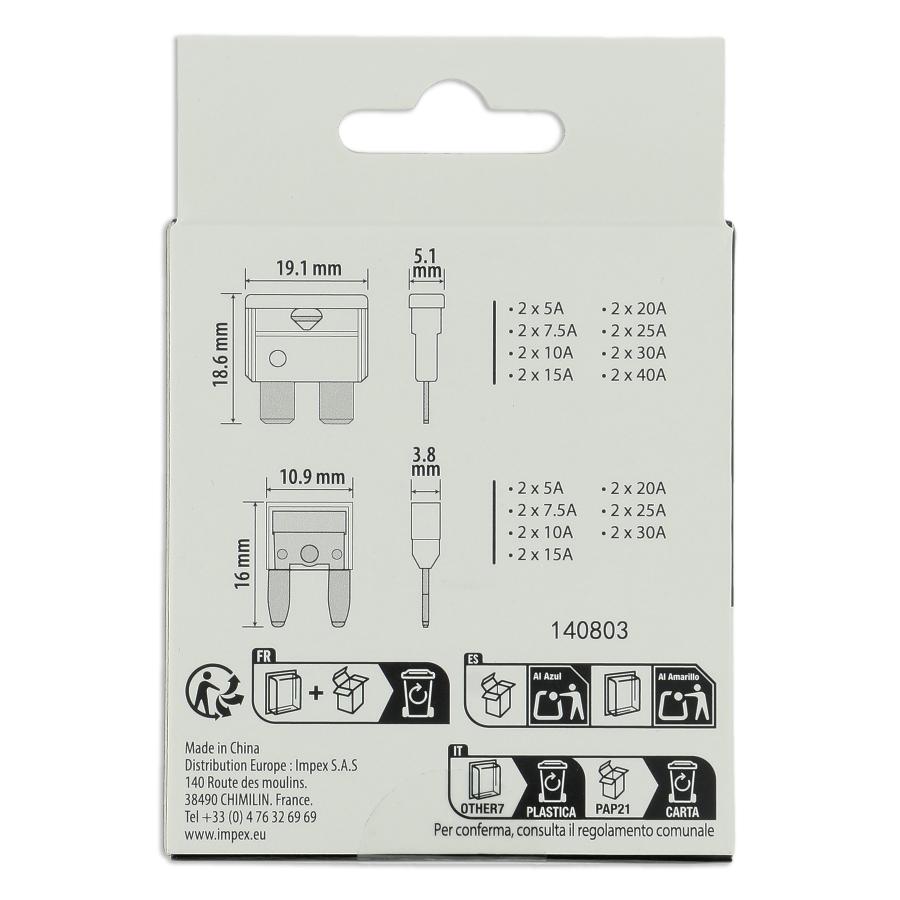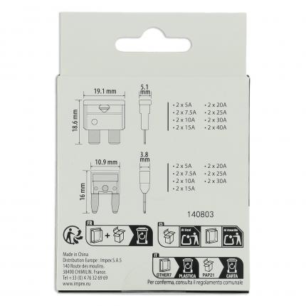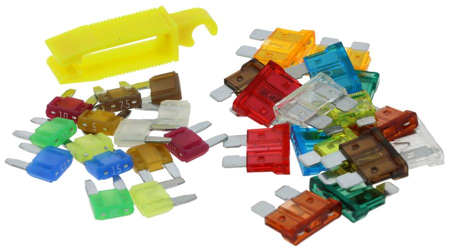 15 fusibili a spina: 5A x 2 / 7,5A x 2 / 10A x 2 / 15A x 2 / 20A x 2 / 25A x 2 / 30A x 2 / 40A x 2 15 mini fusibili: 5A x 2 / 7,5A x 2 / 10A x 2 / 15A x 2 / 20A x 2 / 25A x 2 / 30A x 2 1 utensile per la rimozione dei fusibili