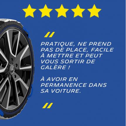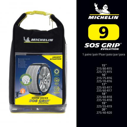 MICHELIN S.O.S. GRIP® EVOLUTION calze da neve in tessuto alte prestazioni e facili da installare. La nuova, esclusiva struttura tessile MICHELIN offre agli automobilisti un'aderenza eccellente, massima trazione e facilità di montaggio,(in meno di due minuti), senza sforzo. Grazie allo sviluppo dei tessili multi-bande ultra-assorbenti, le prestazioni delle calze S.O.S. GRIP® EVOLUTION aumentano del +50% su neve all'avvio. Il battistrada in poliestere ad alta resistenza permette di riutilizzare il prodotto per più stagioni. Infine, MICHELIN S.O.S. GRIP® EVOLUTION è dotato di un sistema riflettente Night Vision Security che aumenta la visibilità laterale del veicolo nelle ore notturne. Compatibile anche con i dispositivi ESP e ABS, questa calza da neve non genera alcuna vibrazione durante la guida. MICHELIN S.O.S. GRIP® EVOLUTION è un dispositivo particolarmente indicato per l'utilizzo in emergenza su strade innevate, a breve distanza e ad una velocità massima di 50 km/h. Adatto anche per veicoli con passaruota ridotti. Grazie alla sua borsa smart transport ultracompatta, le calze S.O.S. GRIP® EVOLUTION saranno sempre a portata di mano. Contenuto/borsa: 1 paio di catene da neve in tessuto, 1 paio di guanti, 1 manuale d'uso Omologate EN16662-1