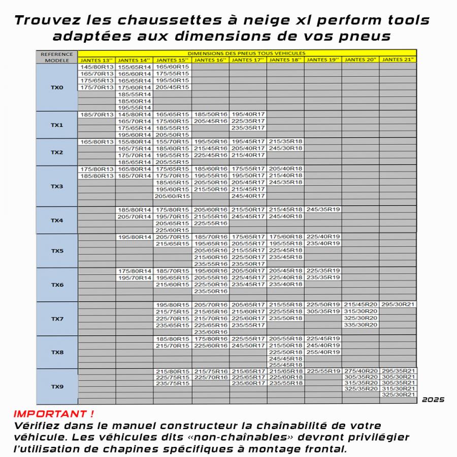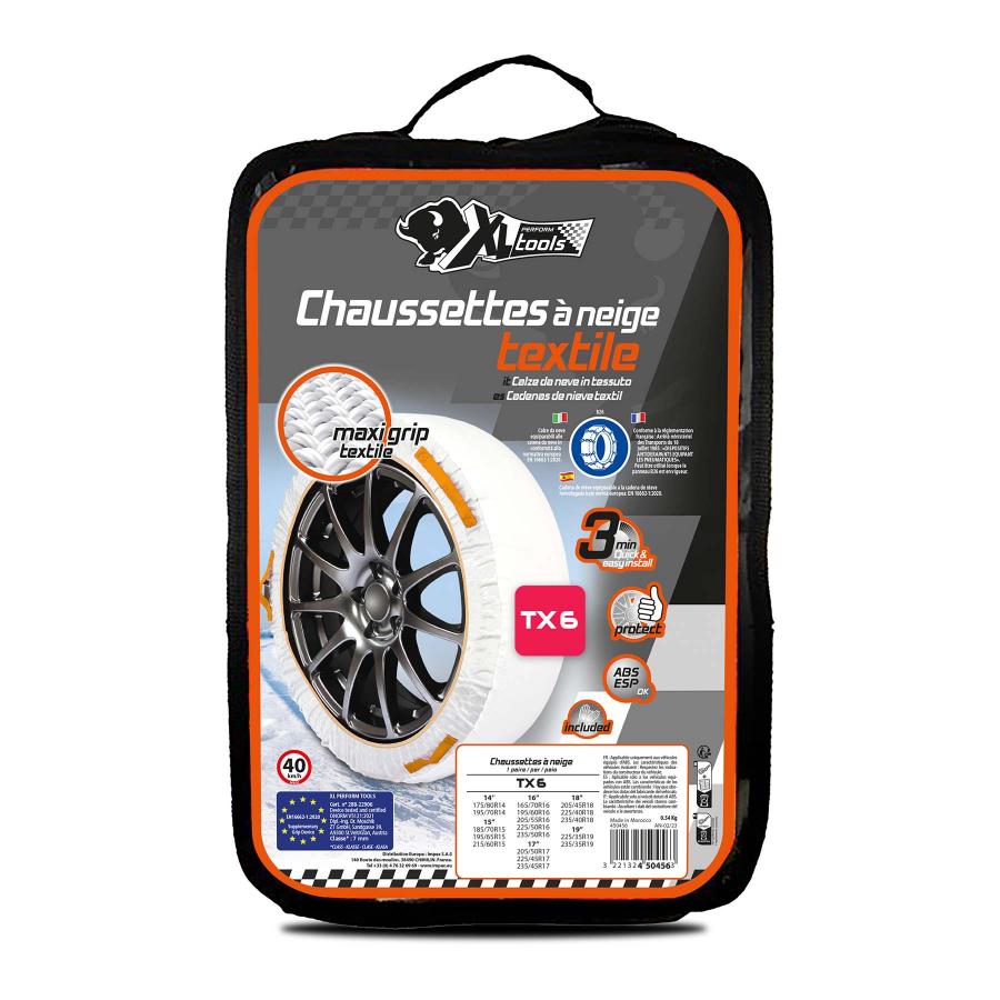 Catene da neve TESSILE alte performance XL Perform Tools. - rapide e facili da installare e smontare - particolarmente adatte ai veicoli con passaggi di ruota ridotti. - struttura TESSILE esclusiva e brevettata, che procura un buon livello di aderenza su ghiaccio e neve. - dispositivo particolarmente adatto per un uso d'emergenza su corta distanza ed a una velocità massima di 40 km/h. Contenuto della borsa : 1 paio di catene tessile, 1 paio di guanti, istruzioni per l'uso. Per veicoli fino a 2T massimo. Calze da neve equiparabili alle catene da neve in conformità alla normativa europea EN 16662-1:2020. 10 misure diverse.