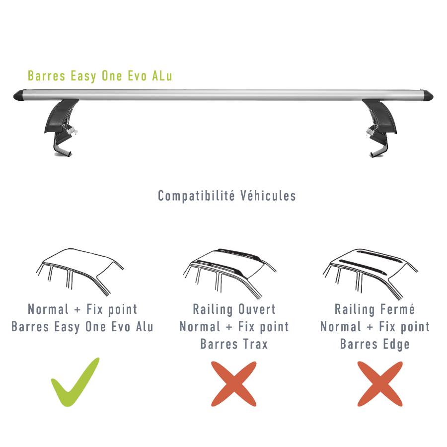 Barre portatutto Green Valley 2 Easy One Alu n°55 Barre portatutto complete in profilo di alluminio con piedini premontati, pronte all'uso. Profilo in alluminio con scala graduata per il posizionamento dei piedini. Il kit Easy One Alu è progettato specificamente per il montaggio su tetti normali (vedere l'elenco delle assegnazioni)
