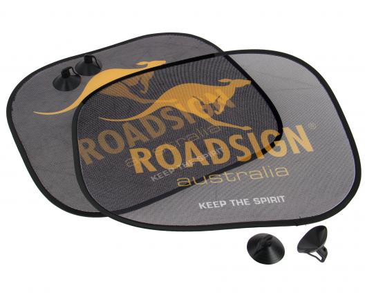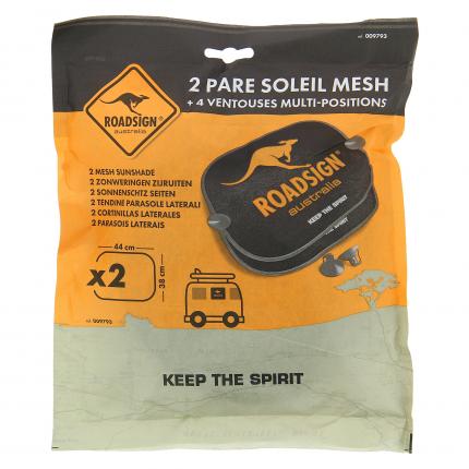 Proteggi il tuo cockpit del sole con lo spirito ROADSIGN Per il comfort dei tuoi passeggeri, queste 2 tendine proteggono senza occultare la visibilità. 4 ventose sicurizzate multiposizione Forma standard (B) Dimensioni 44 x 36 cm Pieghevoli con movimento di torsione
